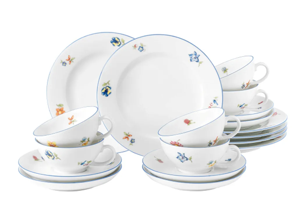 Dieses Set besteht aus:6x Teeobertasse klein 0,14ltr. 6x Teeuntertasse klein 13cm6x Brotteller 17cm1. Wahl, Porzellan, spülmaschinenfest, ofenfest, mikrowellengeeignet.