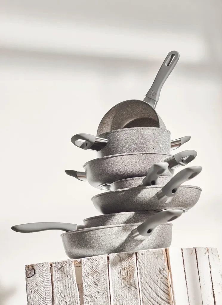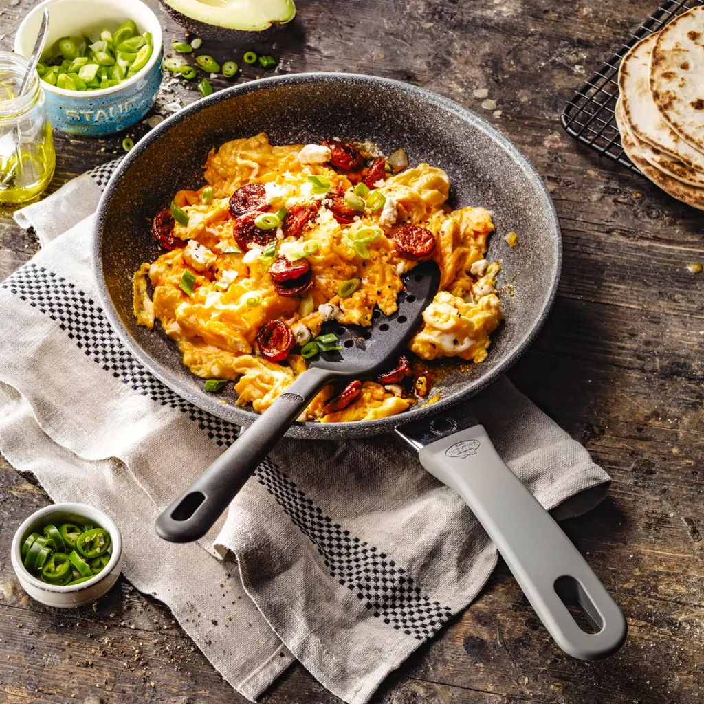Entwickelt wurde das schöne Design des Kochgeschirrs im Granit-Look vom Mailänder Studio Matteo Thun & Antonio Rodriguez. Kratzfest und einfach zu reinigen ist die Pfanne dank der langlebigen, mit Mineralpartikeln verstärkten 5-Lagen-Antihaftbeschichtung GRANITIUM Extreme. Spülmaschinengeeignet ist die Pfanne dabei ebenfalls. Das hochwertige Material aus massivem, geschmiedetem Aluminium spart wertvolle Zeit beim Aufheizen. Induktionsgeeignet? Auf jeden Fall! Wenn du einen Induktionsherd hast, kannst du sogar zusätzlich Energie sparen, denn der Radiant Induktion Boden verteilt die Wärme ideal und spart somit Energie. Der praktische Thermopoint am Stiel wechselt die Farbe, wenn die ideale Brattemperatur erreicht ist.