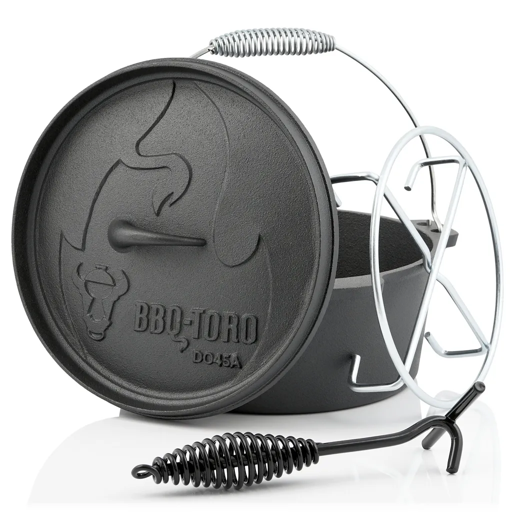 Was ist der Dutch Oven? Ein schwerer, traditioneller, gusseiserner Topf und ein exakt passender Deckel mit dem man überall kochen, braten, schmoren, frittieren, dünsten und backen kann. Egal ob Feuerstelle, Grillplatz oder Lagerfeuer, er ist mobil und flexibel einsetzbar. Der Dutch Oven reguliert dank seiner hohen Masse (Gusseisen) ungleichmäßige Hitze und ermöglicht so ein gleichmäßiges Garen. Einfach glühende Kohlen, Glut oder Grillbriketts auf den Deckel und unter den Topf geben und das Dutch Oven-Erlebnis kann losgehen. Im Dutch Oven gelingen Gerichte wie Schmorbraten, Eintöpfe, Brot und Kuchen. Die Wendegrillplatte kann von beiden Seiten genutzt werden. Auf der gerippten Seite gelingen perfekte Steaks. Die andere Seite der Grillplatte kann optimal für Omlette und Pfannkuchen genutzt werden, da diese glatt ist.