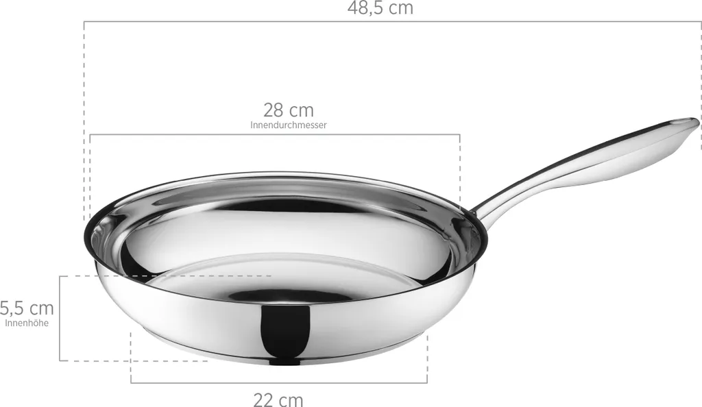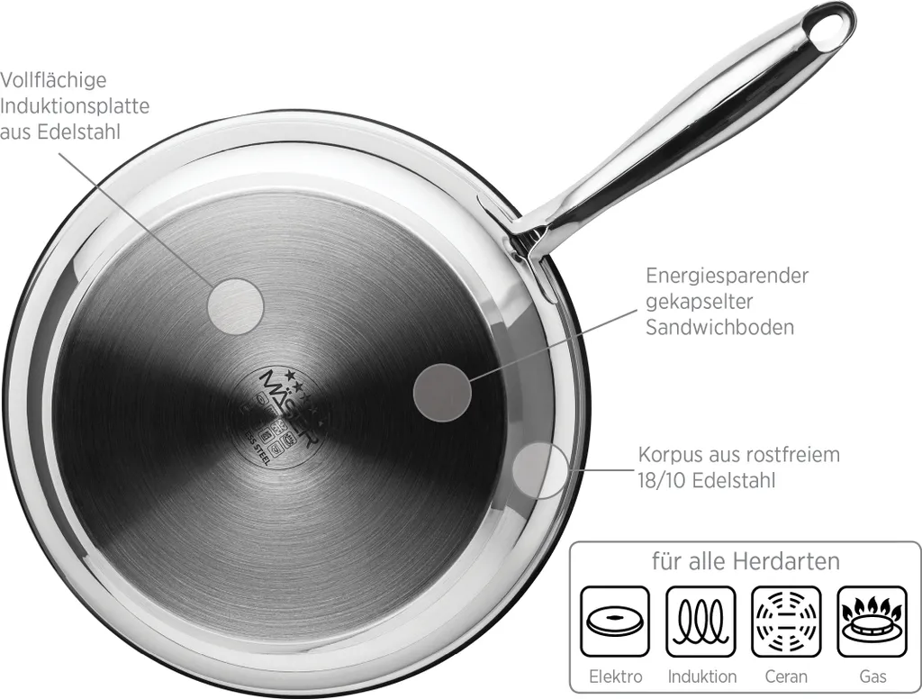 Diese unversiegelte, PTFE-freie Bratpfanne aus der Serie TAVOS der österreichischen Traditionsmarke MÄSER ist aus hochwertigem Chrom-Nickelstahl gefertigt und eignet sich perfekt für krosses oder scharfes Anbraten sowie zum Fondreduzieren, Karamellisieren, Flambieren und Frittieren. Der handfreundliche Kaltmetallgriff sorgt dafür, dass Sie die heiße Pfanne ohne Topflappen anfassen können. Der gekapselte Sandwich-Boden spart nicht nur Energie beim Braten, sondern hält das Bratgut auch nach Abschalten des Herds warm. Wie schon die beliebte Vorgängerserie VARUNA ist auch die Edelstahl-Kochserie TAVOS spülmaschinengeeignet. Jedoch empfehlen wir grundsätzlich bei Kochgeschirr für eine besonders lange Lebensdauer die händische Reinigung.
