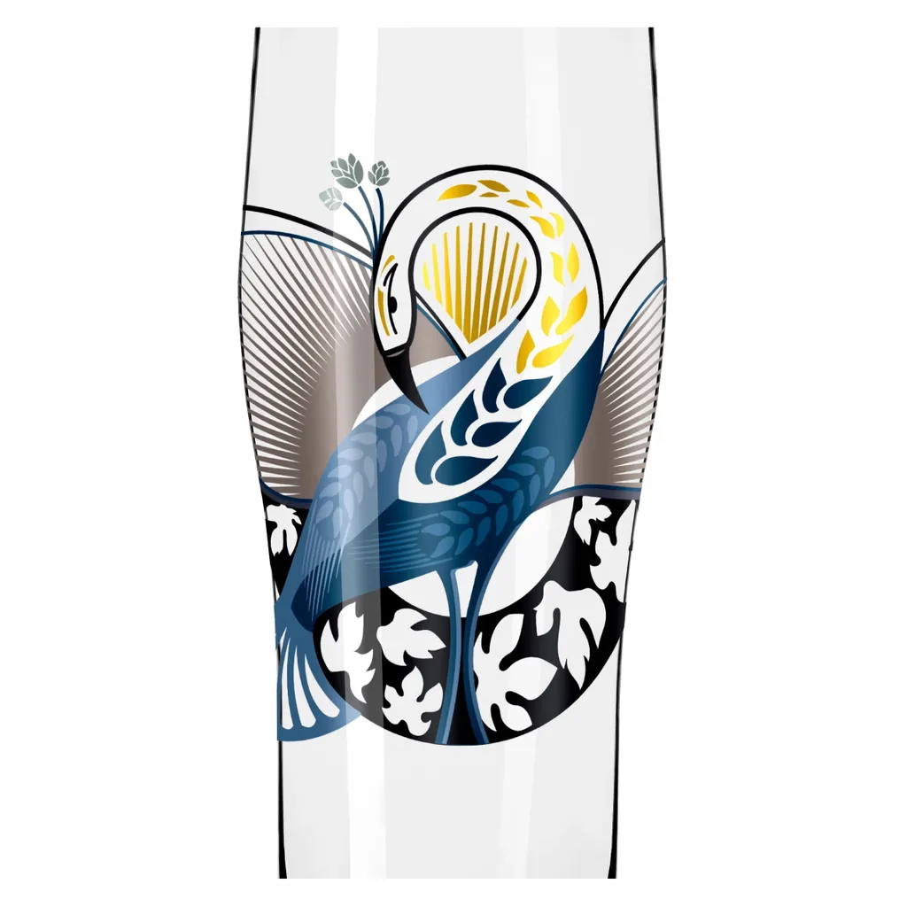 Wie der Phönix aus der Maische: In zwei Darstellungsweisen umschließt das königliche Phantasiewesen das Glas und spielt mit seinem Federkleid aus Gerste und Hopfen auf den Ursprung des Bieres an.