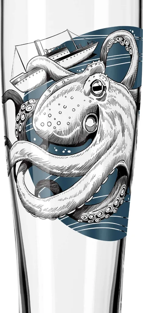 Seemann und Krake. Das Design inszeniert mit akribisch ausgeführten Zeichnungen eine uralte Volkssage, die auf den Weizengläsern in mitreißenden Arrangements für neue Begeisterungsstürme sorgt.