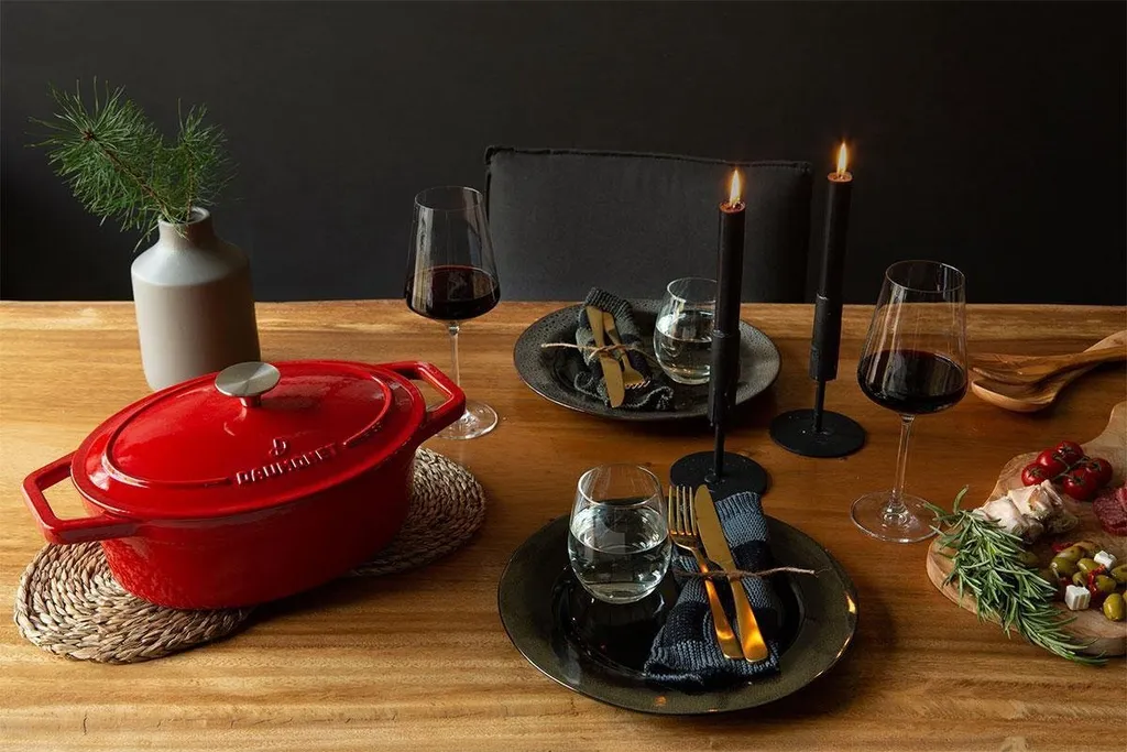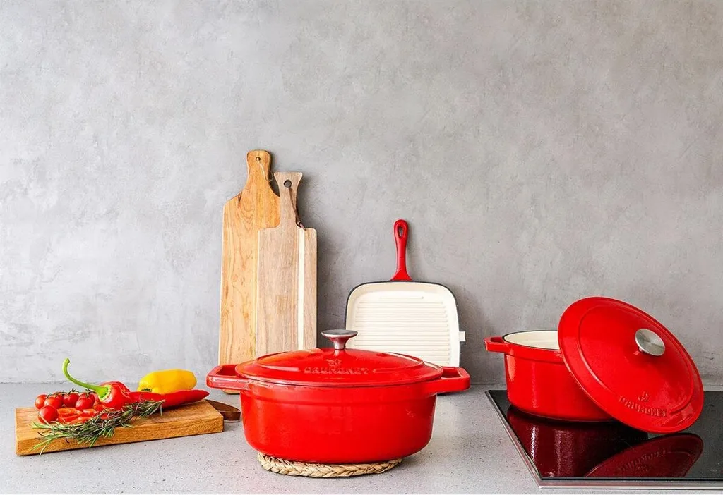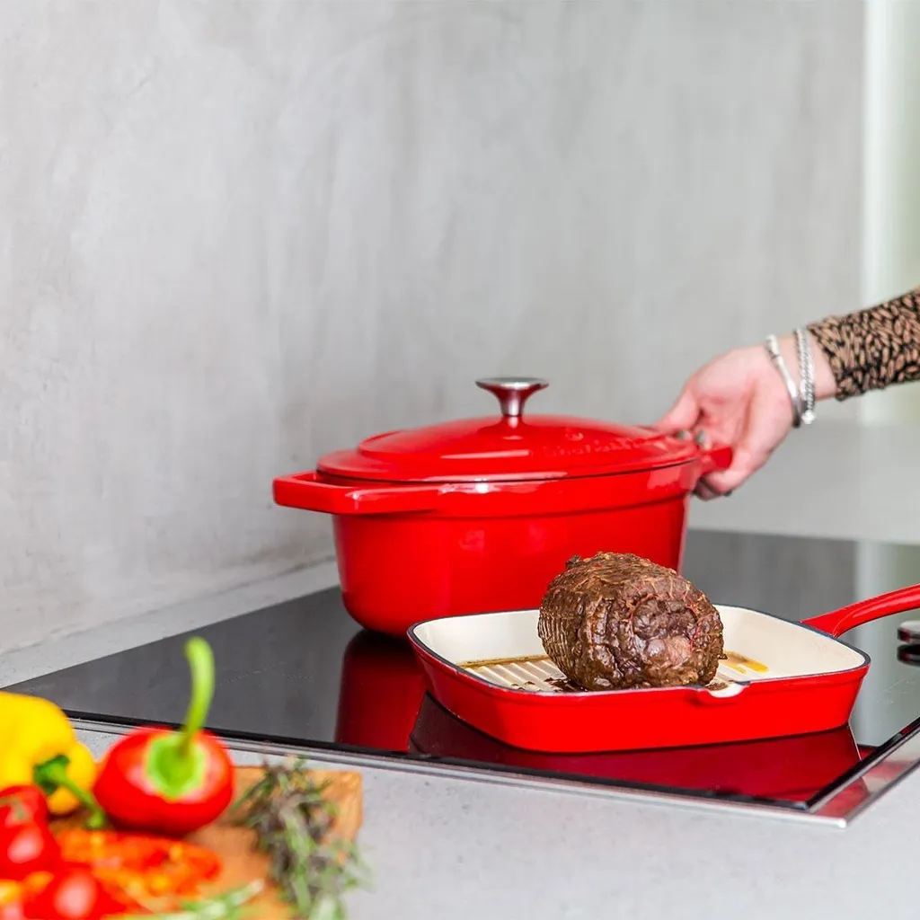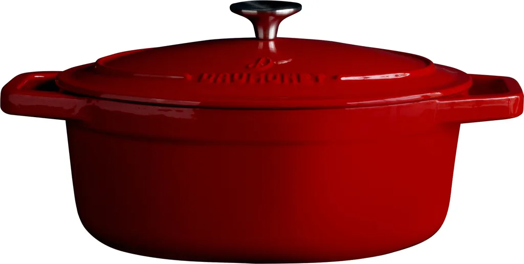 Daumonet Bocuse Rouge authentische Bratpfanne in der Farbe kirschrot. Diese klassische Pfanne ist aus hochwertigem Gusseisen gefertigt und verfügt über eine hervorragende Wärmeleitung. Die Innenseite der Pfanne ist mit der stärksten Emailletechnik ausgestattet, so dass die Pfanne nicht beschädigt wird. Dank der glatten Oberfläche auf der Unterseite ist diese Pfanne für alle Wärmequellen geeignet. Diese robuste Pfanne ist dank ihres Edelstahlknaufs auch für den Backofen geeignet!