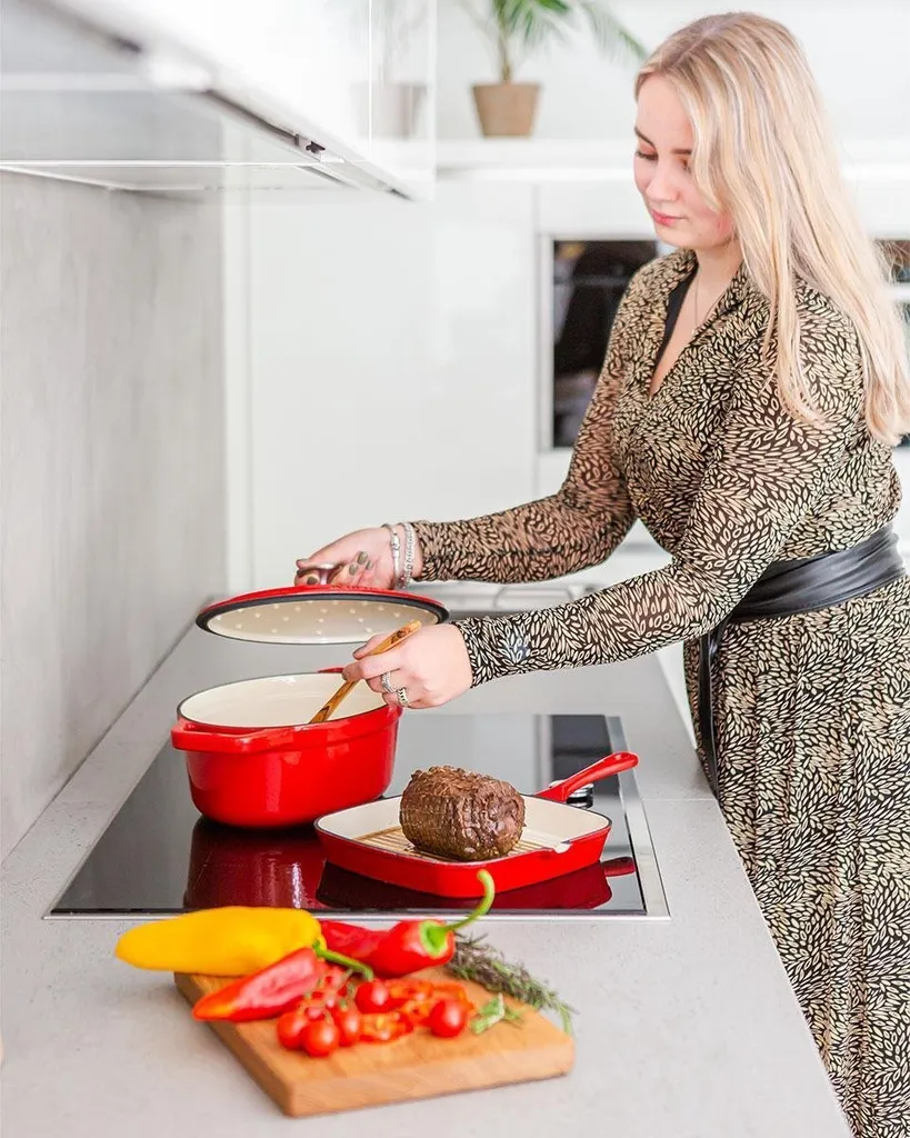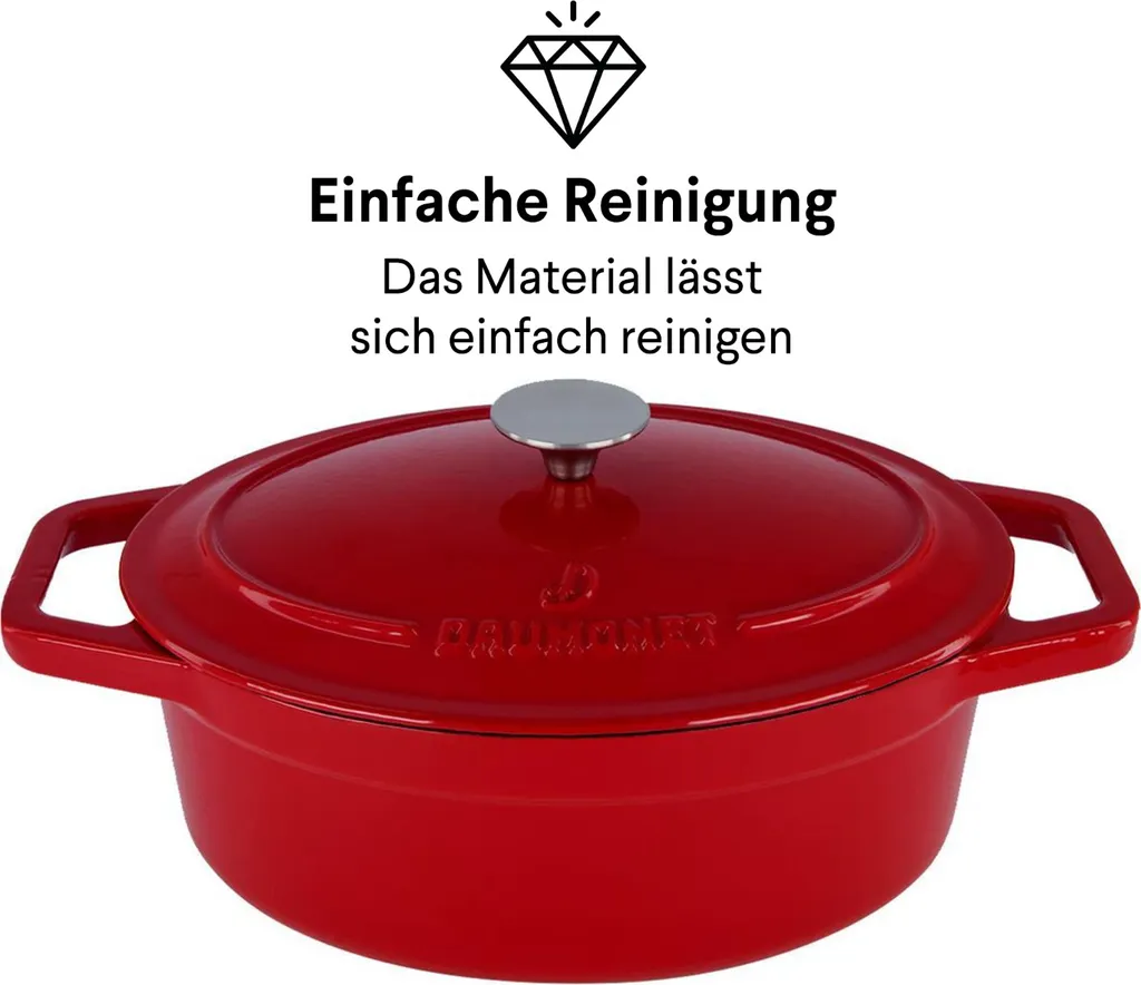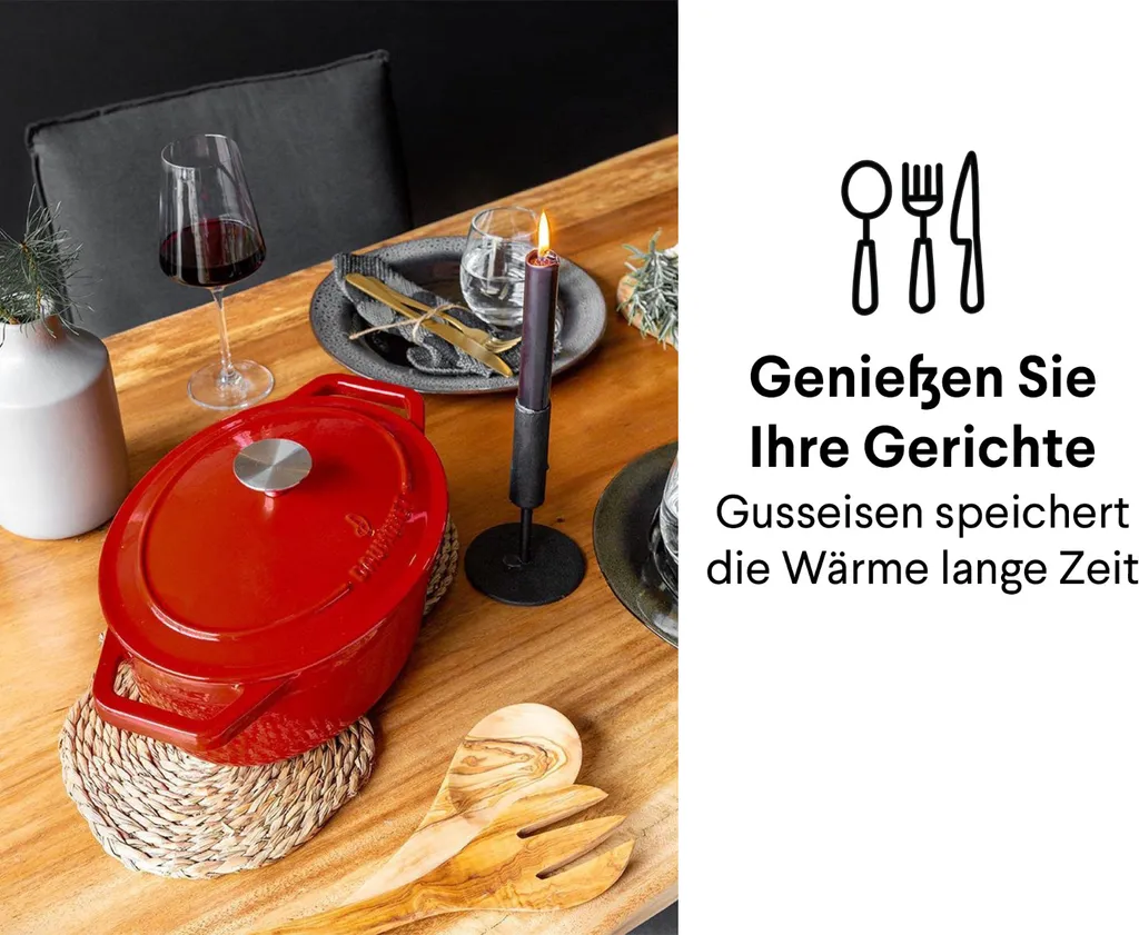 - HOHE QUALITÄT beim Garen : Dank der gusseisernen Pfanne wird das Essen von jeder Seite gleich stark erhitzt. Die heißen Dampfsäfte auf der Innenseite des Deckels beträufeln das Fleisch. So wird das Fleisch zart und trocknet nicht aus!