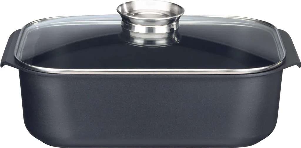Easy Duo Dieser Rechteckbräter mit Glasdeckel und Aromaknopf besteht aus hochwertigem Aluguss mit einer 2-lagigen Antihaftversiegelung im Inneren. Somit gelingen Ihre Gerichte ohne ein Ansetzen des Bratguts, was die anschließende Reinigung besonders leicht und schnell macht. Der Bräter ist darüber hinaus ideal für die fettarme bzw. fettfreie Zubereitung von Speisen im Rahmen einer gesunden und fettarmen Ernährung. Der Bräter besitzt einen Glasdeckel mit Aromaknopf zum einfachen und praktischen Zuführen von Flüssigkeiten während des Garvorgangs, sowie eine extra große Brat- und Garfläche. Die gleichmäßige Wärmeleitung des starken Wärmebodens spart Zeit und Energie beim Garen. Aussen: 40×26 cm Volumen 7 Liter