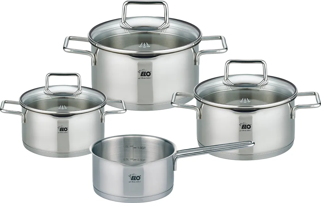 ELO 7tlg. Topfset ‚Smart Steam‘. Neue Technologien fördern Innvovation. Gezielt gesetzte Öffnungen im Deckel und eine entsprechende Ausbuchtung im Topfrand leiten den Dampf seitlich ab. Durch leichtes Drehen des Deckels kann das Abdampfen fein dosiert werden. Ideal geeignet für Herde mit Kochfeldabzug – so werden unangenehme Essensgerüche minimiert. Aus Edelstahl rostfrei 18/10 – außen hochglanzpoliert, innen satiniert mit Literskala und Öl-Dosier System (Oil-Optimizer). Edelstahlbügelgriffe. Glasdeckel mit stoßfestem Edelstahlrand und Silikonumrandung für lautlosen, passgenauen Sitz. Backofengeeignet bis +240°C ohne Glasdeckel (bis +180°C mit Deckel). Energisparender, verkapselter Sandwichboden für beste Waermeverteilung und – speicherung. Für alle Herdarten verwendbar, auch für Induktion. Spülmaschinengeeignet. Bestehend aus je 1 Kochtopf mit Deckel ØxH: 16 x 9,5 cm (1,7 Liter), 20 x 11,5 cm (3,4 Liter), 24 x 13,5 cm (5,8 Liter) und 1 Stielkasserolle ohne Deckel 16 x 7,5 cm (1,3 Liter).