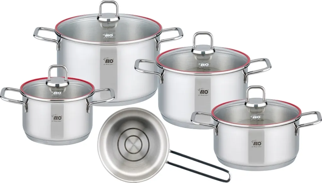 Topfset Excellent 6-teilig aus hochwertigem Edelstahl 18/8, Wandstärke ca. 0,7 mm, Gesamtbodenstärke ca. 5,5 mm, innen satiniert, außen hochglänzend poliert, bestehend aus: 1x Bratentopf 20 cm, je 1 Fleischtopf 16, 20 und 24 cm, 1x Stielkasserolle 16 cm, 1 x magnetischer Silikon Topfuntersetzer Ø 21 cm. Das Topfset Excellent ist mit der einzigartigen ELO Dosierhilfe für Öl in Form von 2 Ringen ausgestattet. Damit wird die Dosierung von Bratölen und flüssigen Bratfetten ein Kinderspiel. Der kleine Ring entspricht ca. einem Teelöffel Öl, der größere Ring ca. einem Esslöffel Öl. Der moderne und stoßfeste Glasdeckel mit rotem Silikonring sorgt für perfekten Sitz und hat ein extra großes Lüftungsloch für kontrolliertes Abdampfen. Energiesparender Kapselboden für wasserarmes und vitaminschonendes Garen | Eingearbeitete Volumenskala in allen Töpfen | Integriertes Öl-Dosiersystem (Oil Optimizer) | stoßfeste Glasdeckel mit rotem Silikonring und extra großem Entlüftungsloch für kontrolliertes Abdampfen | backofenfest bis 240 °C (mit Glasdeckel bis 180 °C) | für alle Herdarten geeignet, auch Induktion.