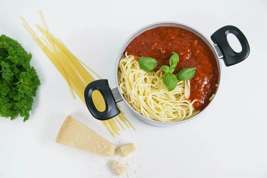 - Kochtopf mit integriertem, schwenkbarem und herausnehmbarem Sieb – für leichtes Abgießen