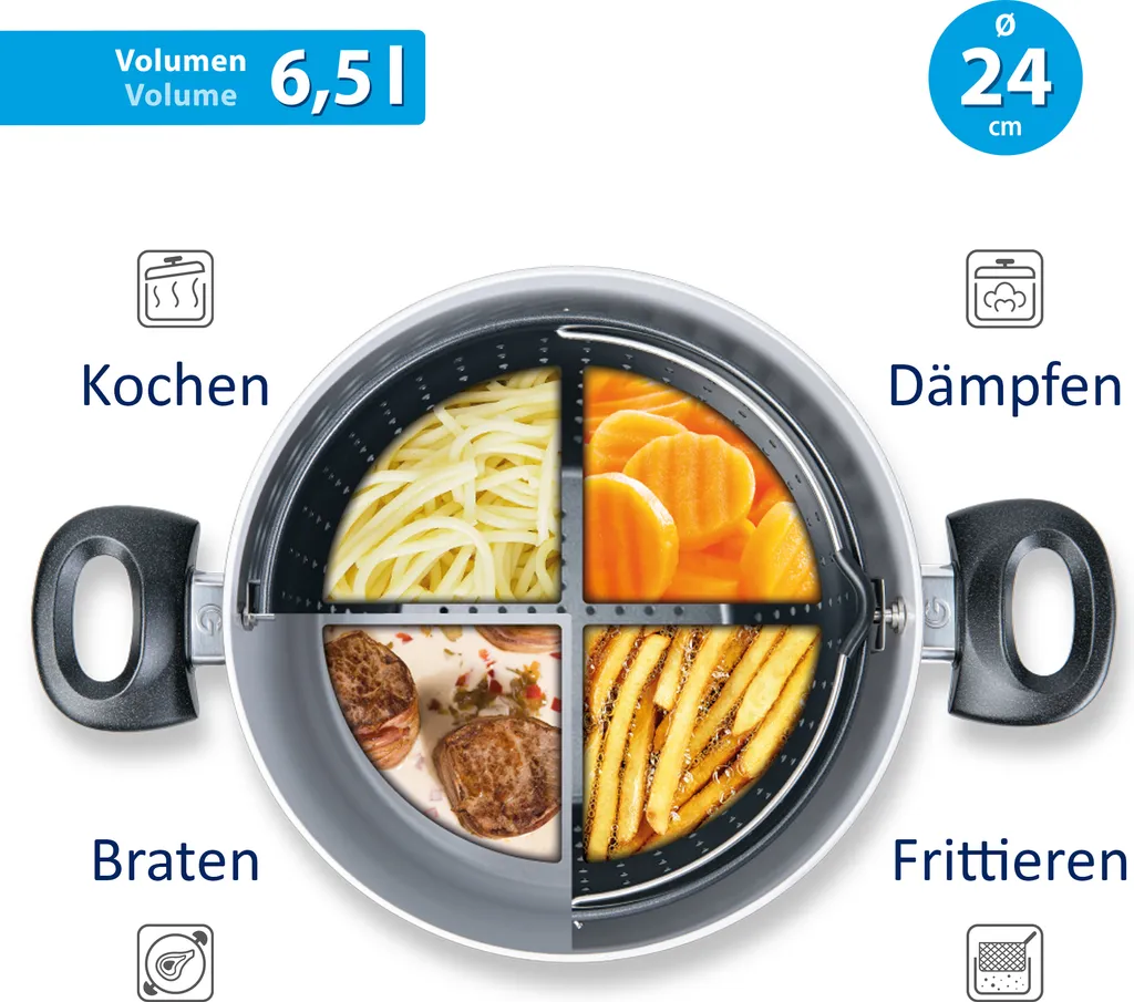 - Perfekt geeignet zum Dampfgaren, Kochen, Schmoren, Braten, Dünsten, Frittieren u.v.m.