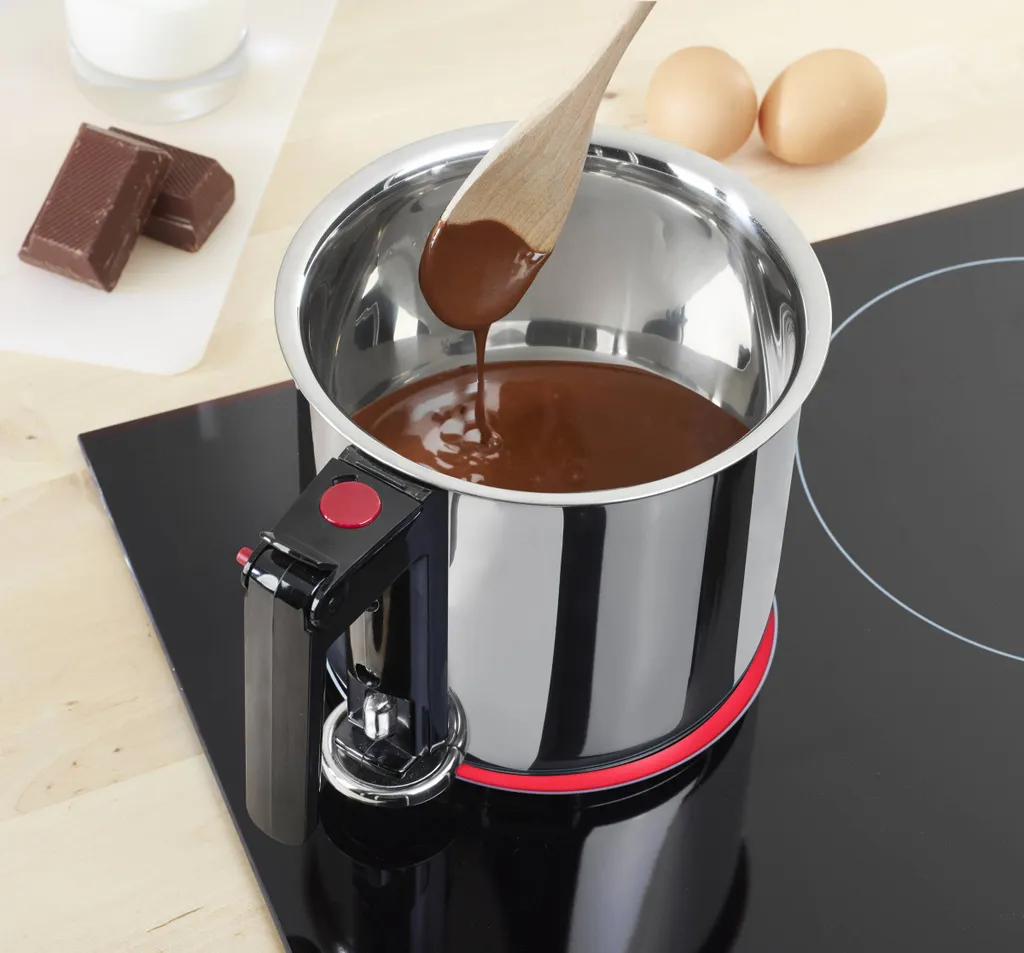 Vermeidet Überkochen, Anbrennen oder Gerinnung dank indirekter Hitze. Einfach Wasser seitlich einfüllen und erhitzen.