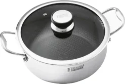 Hensslers 5,0 Liter Kochtopf – Universal Kochtopf mit einem 24 cm Durchmesser gefertigt in einem 3-Schicht Material und Wabenstruktur. Ideal als Bratentopf, Fleischtopf und Gemüsetopf zum schnellen Kochen und Garen von Fleisch, Fisch und Gemüse einsetzbar. Hensslers Kochtopf besticht durch seine perfekte Größe und sein ideales 5 Liter Kochvolumen. Mit seinen 24 cm ist der Kochtopf der ideale Allrounder zum Kochen und Schmoren. Sein besonderes Design spart dabei gleichzeitig Zeit und wertvolle Energie beim Kochen. Kochtöpfe gibt es wie Sand am Meer. Mit Hensslers Kochtopf habt ihr den idealen Begleiter als Wassertopf, Bratentopf, Fleischtopf und Gemüsetopf. Als Allrounder ist er für alle Herdarten einschließlich Induktionsherd, Gas- und Elektroherd sowie Keramikherd geeignet. Selbst für den Backofen ist der 5 Liter Kochtopf bis 250°C hitzebeständig und backofenfest. Das Mehrschichtmaterial und die innovative Wabenstruktur sind die absoluten Highlights von Steffens Kochtopf. Durch mehrere Schichten aus Edelstahl und Aluminium sowie die Antihaftbeschichtung gelingt perfektes Garen im Handumdrehen und weitaus schneller als bei anderen Kochtöpfen. Die interne Zirkulation ist speziell für aufwendige Gar- und Schmorvorgänge besonders hilfreich und schützt vor lästigem Überkochen Eurer leckeren Gerichte.