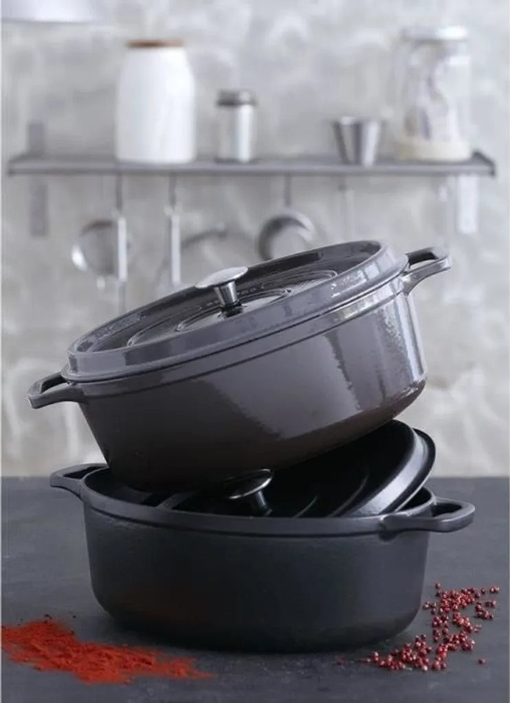 Oval Cocotte – emaillierte Guss – Farbe: Schwarz – Durchmesser: 35 cm – Deckel einer Wasserreserve – Edelstahl Button – Französisch Herstellung – Alle Wärmequellen einschließlich Induktion.