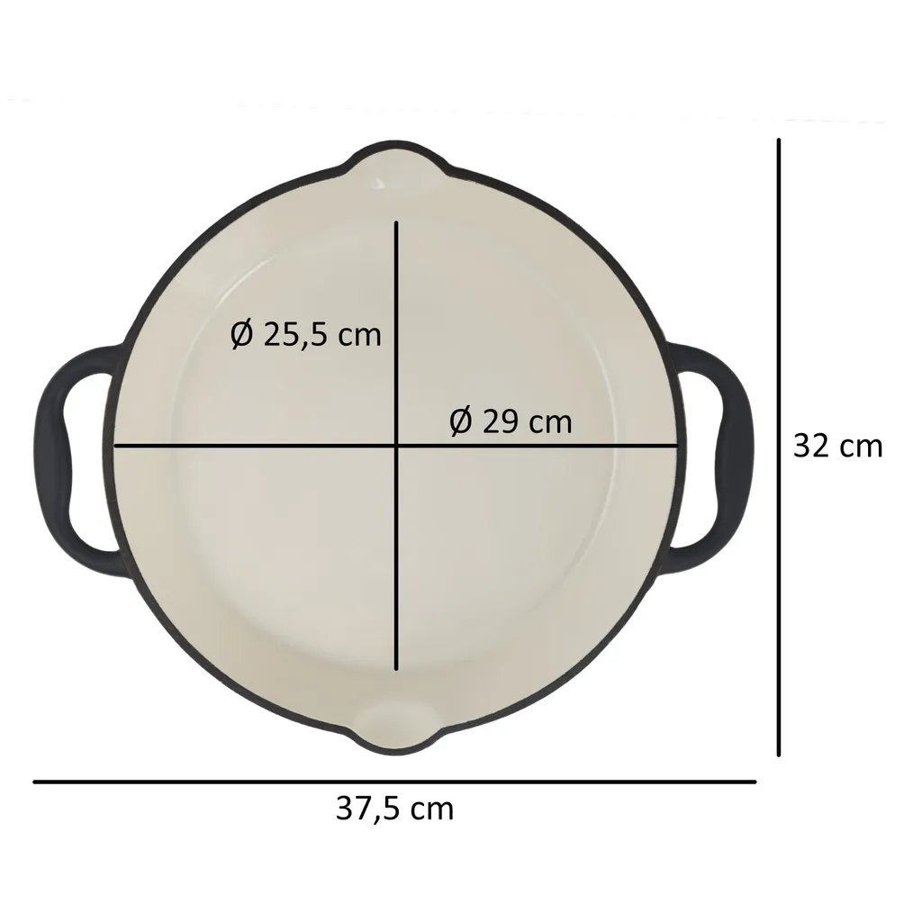 Mit einem Durchmesser von 29 cm bietet die Gußeisenpfanne genügend Platz für ausreichendes Bratgut. Das Gewicht von 3 kg sorgt für einen sicheren Stand. Die emaillierte Pfanne ist die ideale Ergänzung zu Ihrem Küchenequipment.