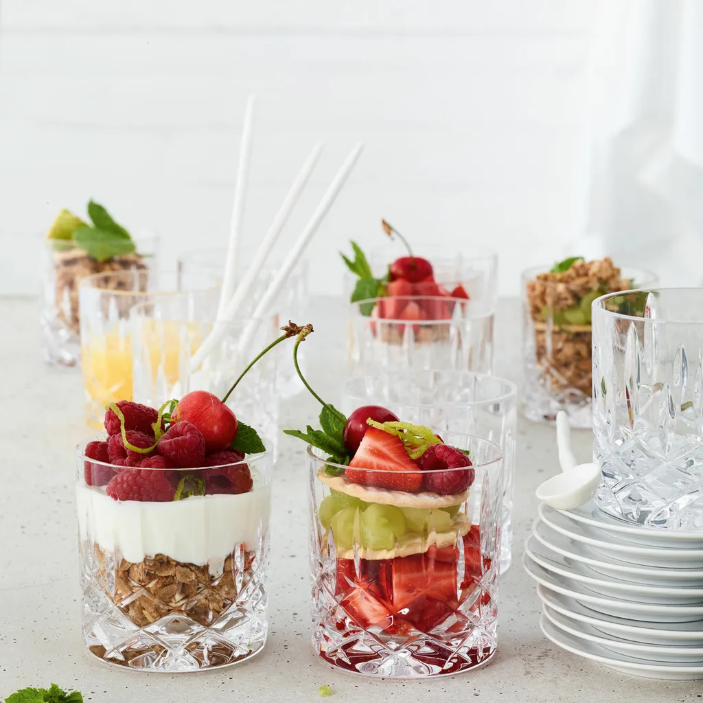 Nachtmann Noblesse steht für eine hochwertige Ausstrahlung. Wunderschön geschliffenes Glas mit Rautenmuster ist das Markenzeichen dieser Linie, die aus Kristallglas hergestellt wird. Kristallglas ist reiner und heller als gewöhnliches Glas, so dass das Glas mehr funkelt, wenn Licht darauf fällt. Die Härte des Glases sorgt dafür, dass es kratzfest ist und trotz Verwendung in der Spülmaschine glasklar bleibt.