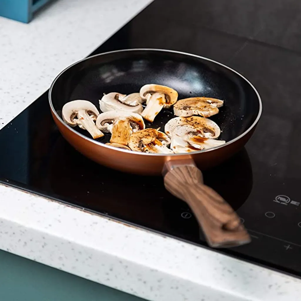 Unsere Kupferpfanne hat ein robustes, zuverlässiges Design mit einem griffigen Bakelit-Griff, der die Bedienung erleichtert und Verbrennungen oder ungewollte Unfälle verhindert, und mit ihrer eleganten Kupferfarbe und der keramischen Antihaftbeschichtung auf der Innenseite werden Sie sich sofort in dieses Pfannenset verlieben.