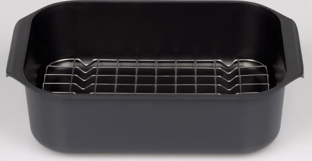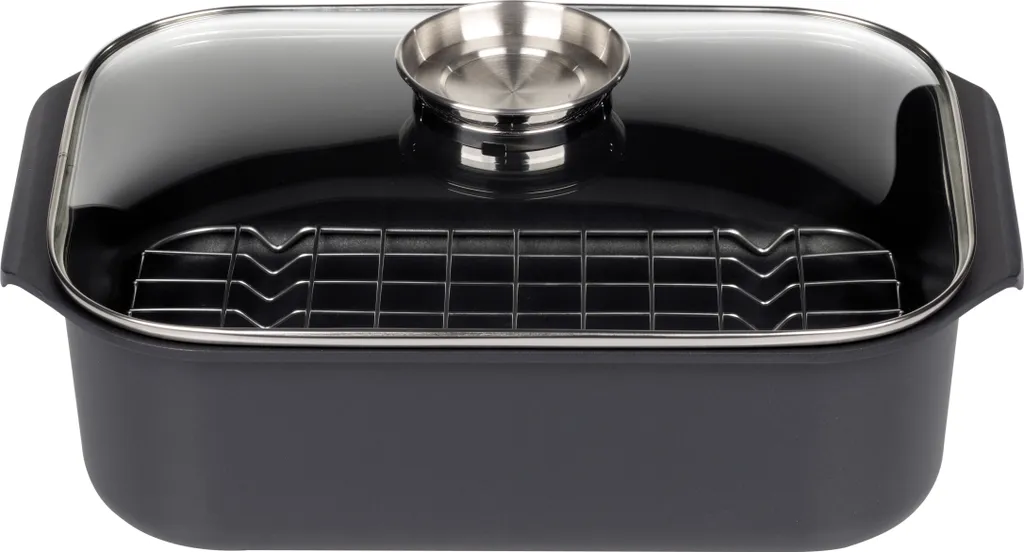 Dieser Rechteckbräter aus hochwertigem Aluminium-Guss ist äußerst robust, mit einem Aroma-Glasdeckel zum Beträufeln des Kochguts mit Flüssigkeit und einem Grilleinsatz ausgestattet. Die mehrfache, langlebige Antihaft-Versiegelung ist ideal für fettarmes Kochen, verhindert ein Ankleben der Speisen und ist leicht zu reinigen. Zudem ist der Bräter backofengeeignet bis 240°C, sowie spülmaschinengeeignet.