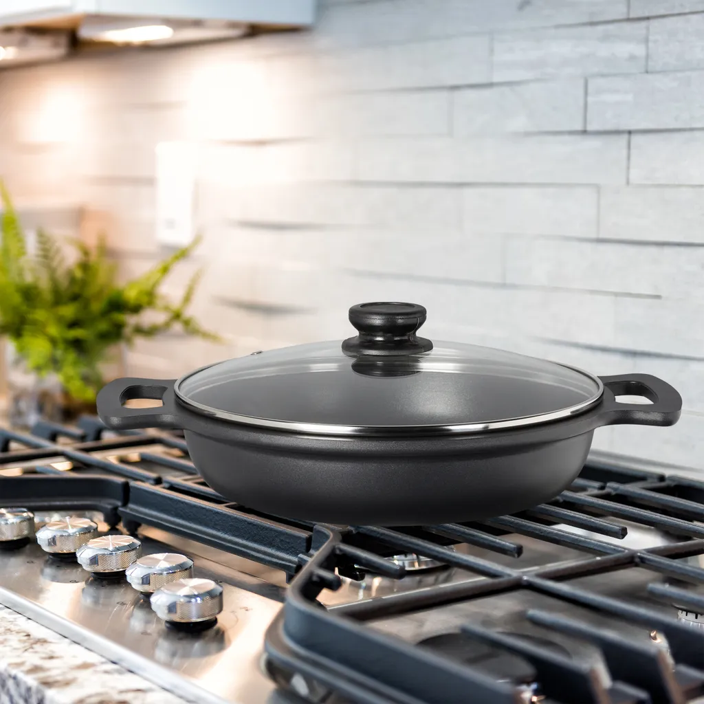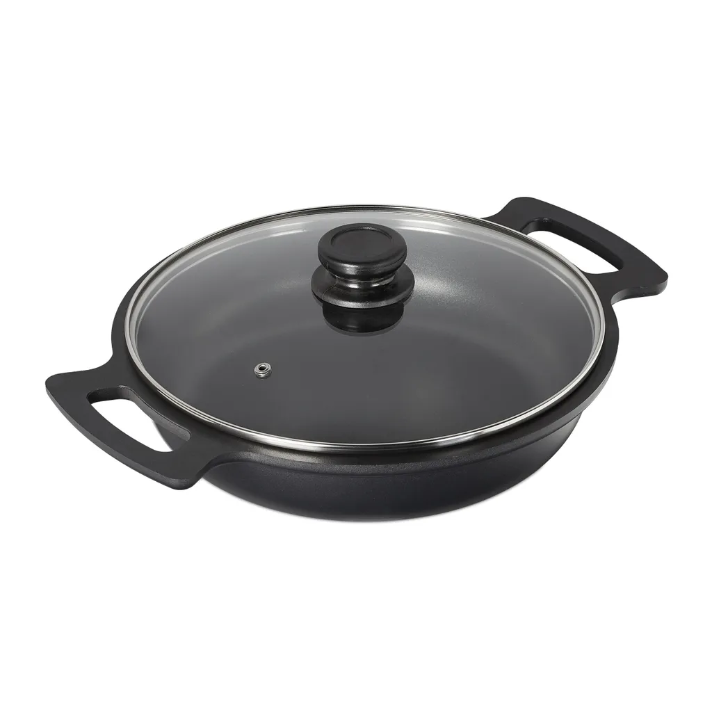 Mit dieser Aluminiumpfanne holen Sie sich einen echten Brat-Allrounder. In der Bratpfanne zaubern Sie genussvolle aromatische Gerichte mit Fleisch, Gemüse und Fisch. Aber nicht nur auf dem heimischen Herd, auch bei Ihrer Grillparty im Garten oder auf der Feuerstelle kommt die Feuerpfanne zum Einsatz. Dank der 2 Griffe kann die elegante Pfanne auch gleich zum Servieren verwendet werden. Durch die Antihaftbeschichtung benötigen Sie weniger Fett zum Anbraten und die Reinigung ist erleichtert.