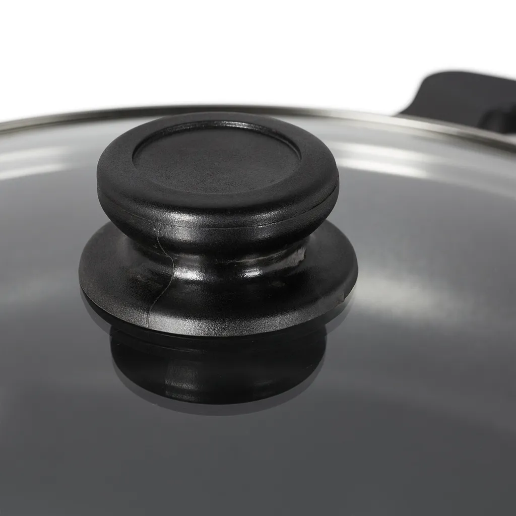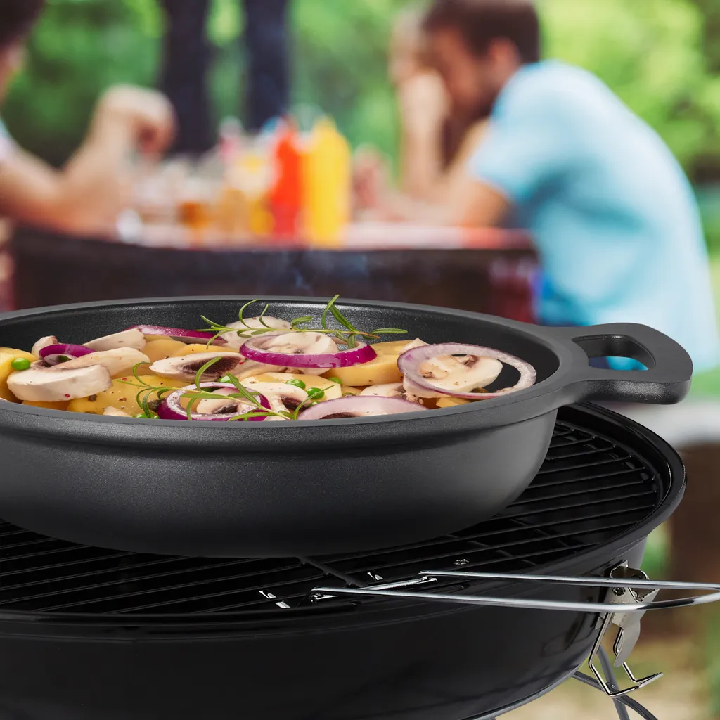 Hinweis: Auf dem Grill, der Feuerstelle oder im Backofen die Pfanne ohne Deckel verwenden. Die Griffe der heißen Pfanne nur mit Topflappen anfassen.