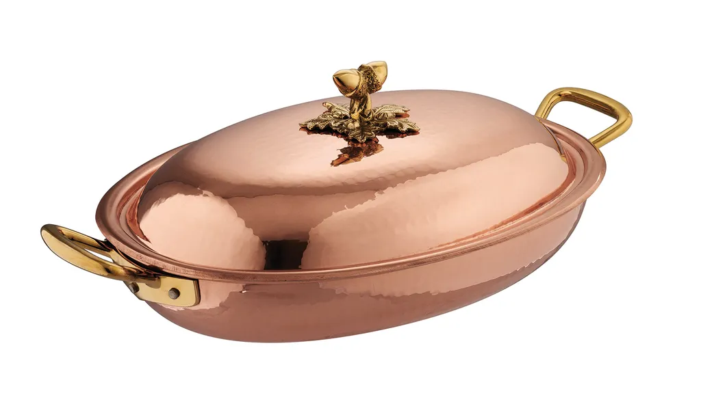 Das mit Zinn ausgekleidete legendäre gehämmerte Kupferkochgeschirr, mit dem wir Jahrhunderte der Geschichte, Erfahrung und Traditionen neu erleben. In der Werkstatt der Familie Ruffoni in den italienischen Alpen von einem einzigen Kupferblech gehämmert, sorgen diese Kochgeschirre für maximale Wärmeleitfähigkeit und Temperaturkontrolle. Der Innenraum wird von Hand mit der reinsten, haltbaren nichtreaktiven Dose ausgekleidet. Vernietete, handgegossene Bronzegriffe und Deckelknöpfe verleihen der einzigartigen Qualität dieser Objekte einen krönenden Abschluss. Empfohlen zum Kochen auf dem Gasherd oder im Ofen und für eine umwerfende Präsentation am Tisch.