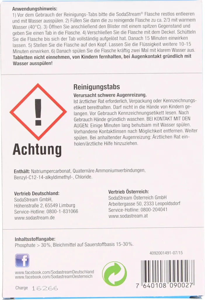 SodaStream Reingungstabs für PET-Flaschen (10 tabs) Zur hygienischen Reinigung Ihrer SodaStream PET-Flaschen ::: Ein Paket enthält 10 Tabs Produktbeschreibung Reinigungstabs 10er Rechtliche Hinweise Verkauf von privat.