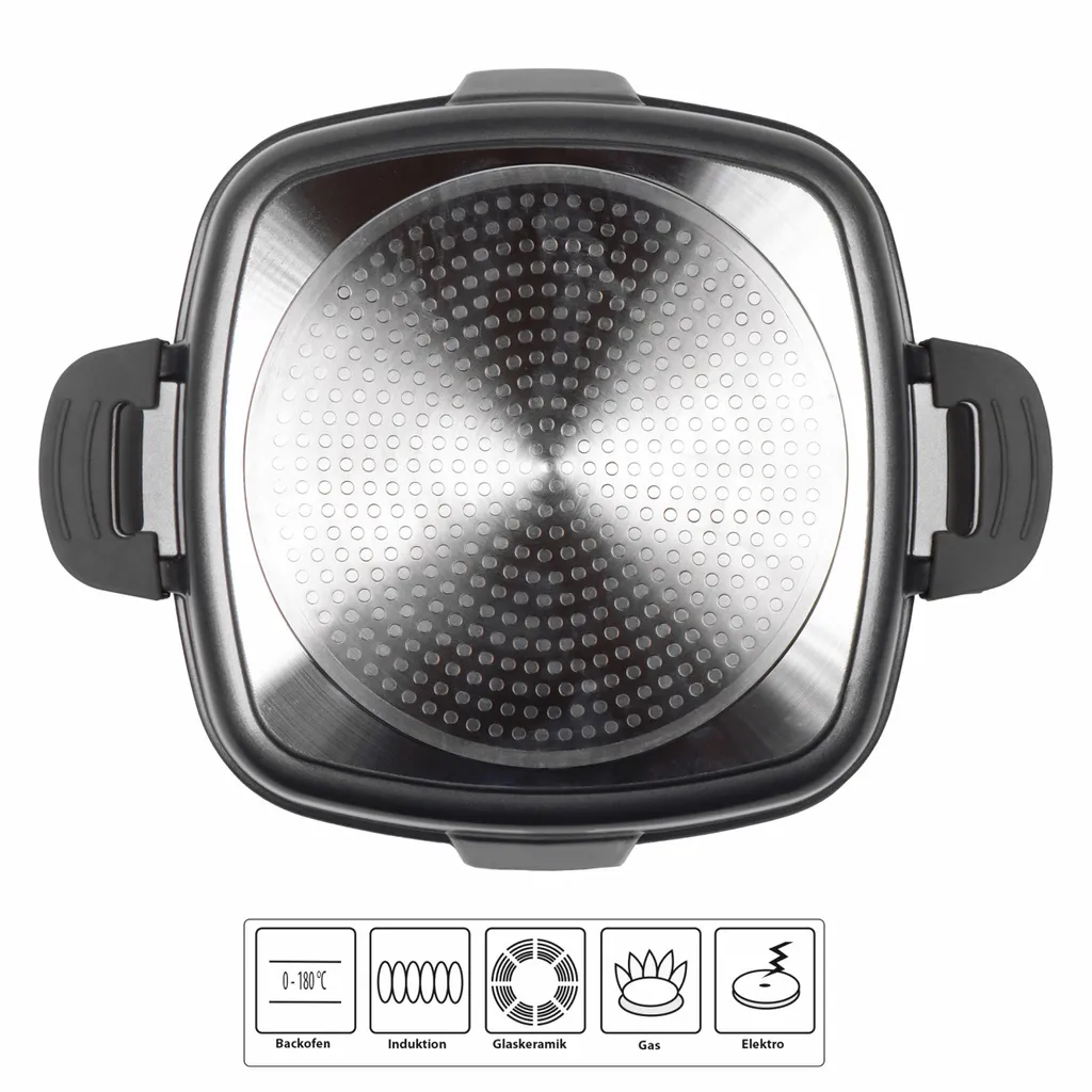 Im Set enthalten ist neben dem Smell Well Glasdeckel mit Siebfunktion außerdem die STONELINE® FUTURE Eckpfanne mit 24 x 24 cm. Die Eckpfanne hat mit 6,7 cm einen extra hohen Rand und ein Fassungsvermögen von ca. 3,0 Liter und eignet sich dadurch hervorragend für alle Brat- und Schmorgerichte!