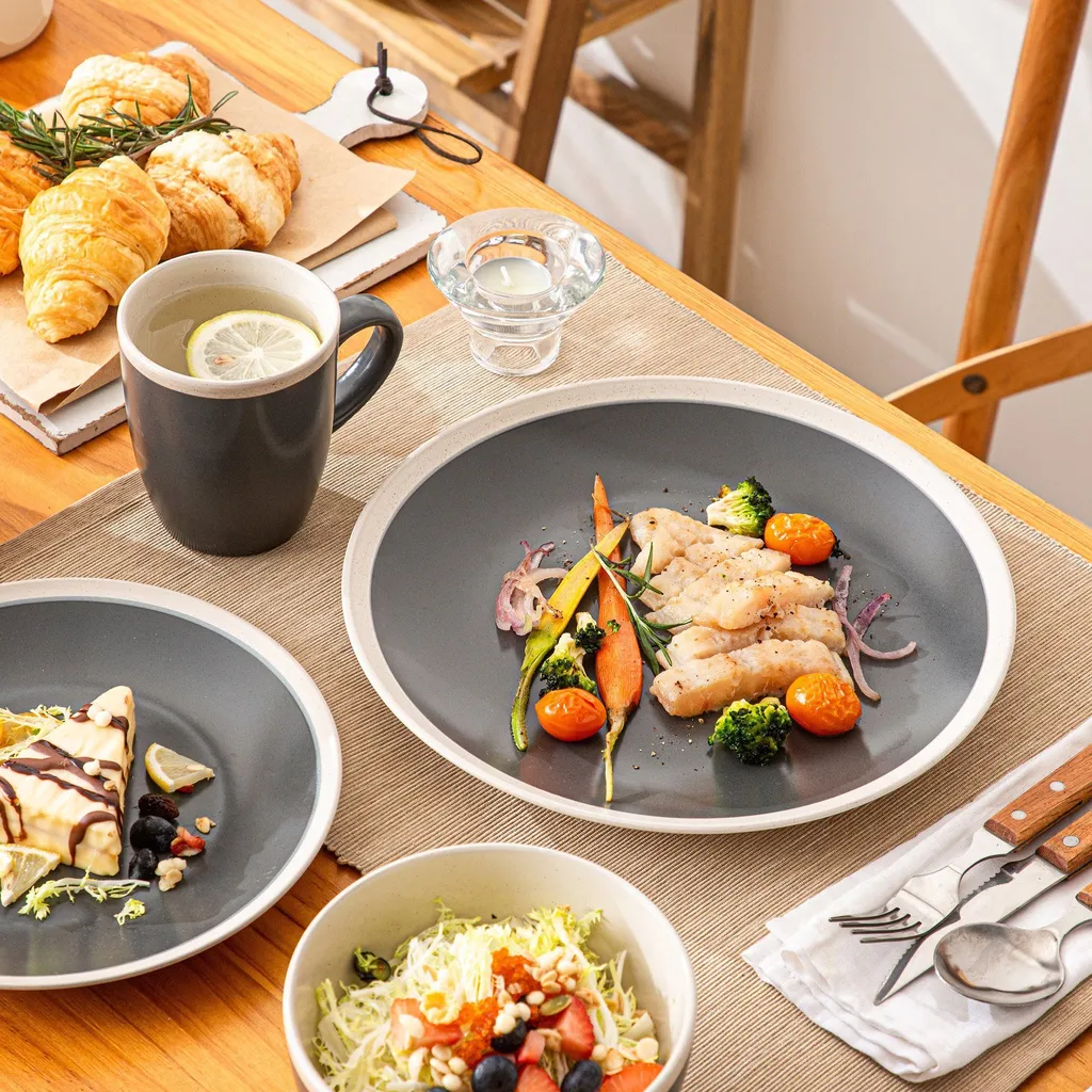- Individuelles modernes Design. Aus hochwertigem und umweltfreundlichem Steingut ist das Geschirrset von Hand gefertigt. Einzigartige schwarze Sesam Oberfläche, ungewöhnliche weiße Kante, wunderschönes mattes Design, vielfältige Farbungen und stilvolle moderne Optik entsteht eine angenehme Harmonie, was Ihren Tisch etwas schick machen;