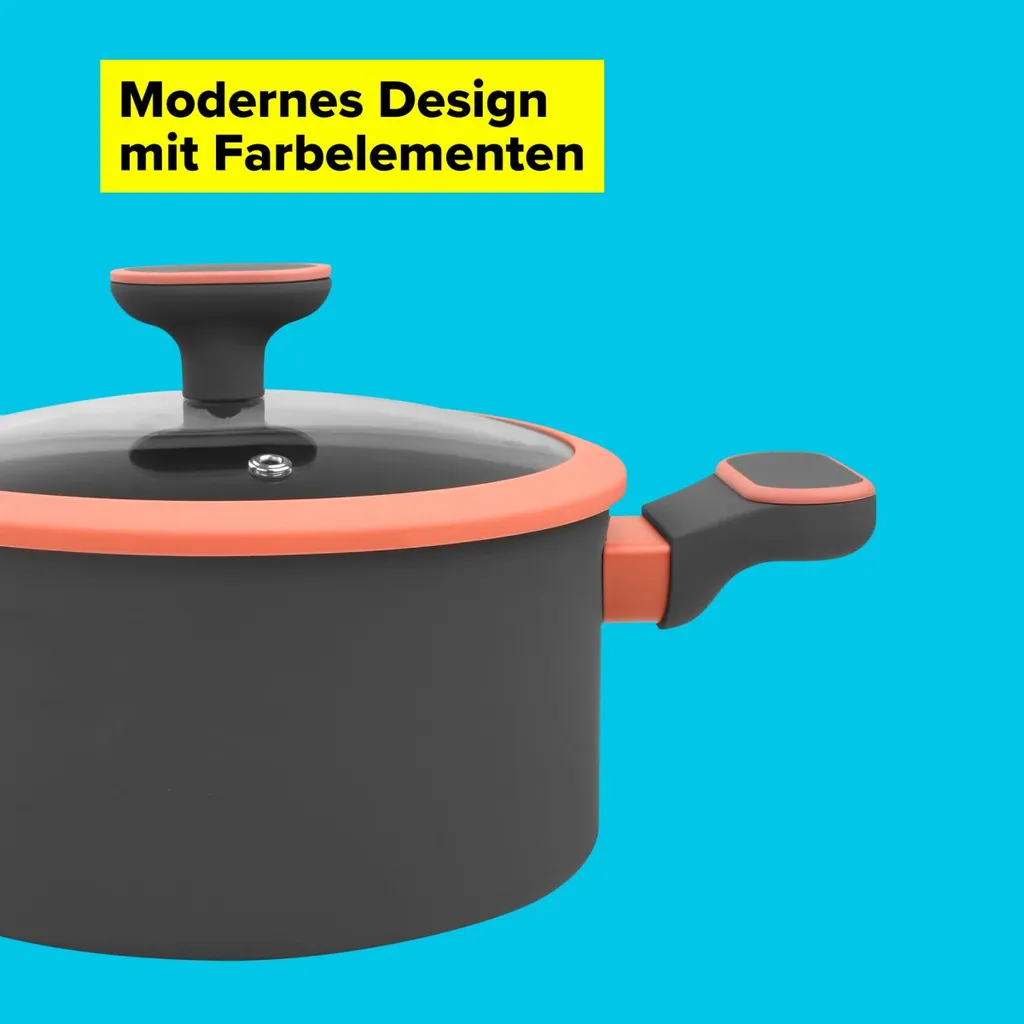 Was muss ein guter Kochtopf können? Der Tasty Antihaft-Kochtopf (Ø 20 cm). Er hat die perfekte Größe für alles, was gekocht werden kann. Die Softtouch-Griffe und der Knauf am Deckel liegen dabei bequem in der Hand und machen in einer coolen Kombination aus Orange und Grau ordentlich was her. Der Kochtopf ist natürlich für alle Herdarten inklusive Induktion geeignet.