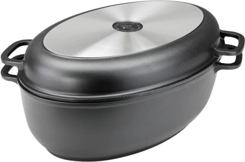 Alu – Guß Bräter oval mit hochwertiger Antihaft-Beschichtung, Innenmaß Topf: ca. 38 x 25 x 13 cm, Fassungsvermögen (Topf): ca. 8 Liter, Innenmaß Deckel: ca.37 x 24 x 5,5, Fassungsvermögen (Deckel): ca. 2,5 Liter, Deckelhöhe: 5,5 cm, Wandstärke: 2,6 mm, Bodenstärke: 4,8 mm, Gewicht Körper: ca. 1460 g, Gewicht Deckel: ca. 1052 g, geeignet für Gas, Elektro und Ceran KochfelderSpülmaschinen geeignet