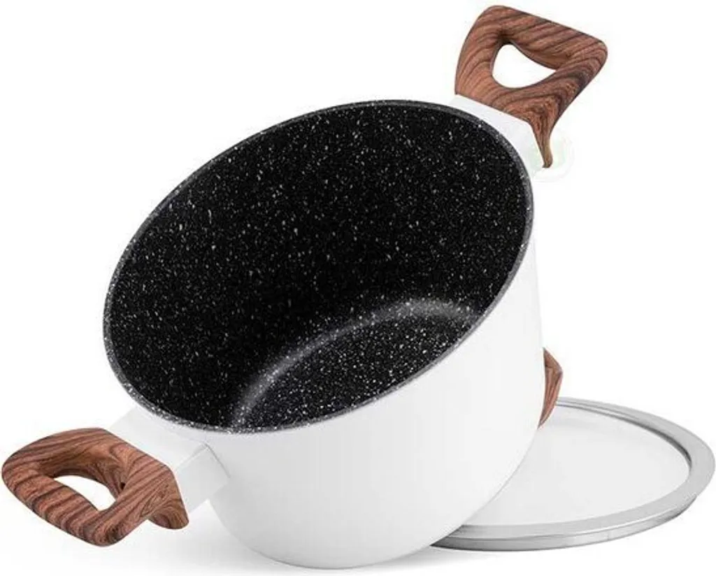 Dank der Granitbeschichtung sind die Töpfe beständig gegen Kratzer. Dieser Art von Töpfen ermöglicht das Braten mit minimalen Einsatz von Fett. Das Geschirr heizt sich ähnlich wie ein Stein auf und gibt dir Wärme mit der ganzen Fläche ab.
