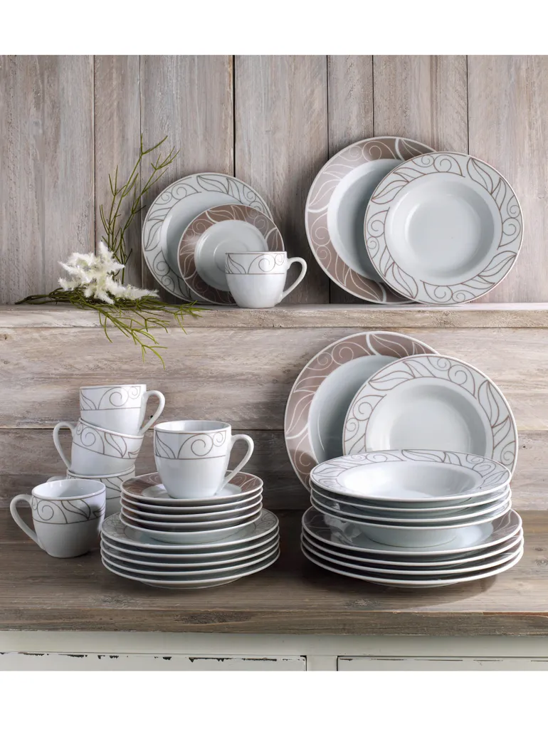 18tlg. Kaffeeservice ‚Grenoble‘. Runde Form. Weiß mit einemNachbildung in braun-grau. Spülmaschinen- und mikrowellengeeignet. Material: Porzellan. Bestehend aus: 6 Obertassen (23,0 cl), 6 Untertassen (15,0 cm) und 6 Dessertteller (19,0 cm).